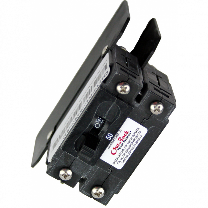 Outback 50A 120/240VAC double pole panel mount breaker with 1/4" stud terminals.