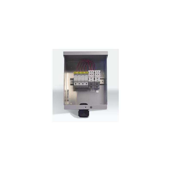 Outback RSD-AFCI ICS Plus PV rapid shutdown for SkyBox. Pre-wired with two contactors and six 600Vdc fuse holders, to support three PV strings