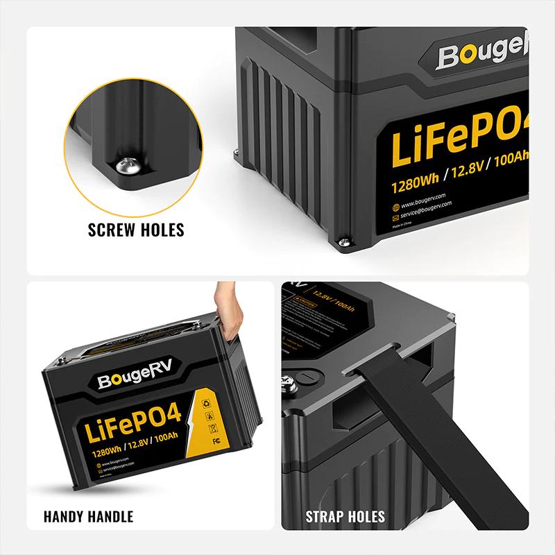 BougeRV LiFePO4 is only 27lbs weight, 50% lighter than a lead-acid battery with same capacity. Comes with 4 fixable holes, you can install the screw and fix the battery stably for RVs, Marine and Off-Grid Applications, it will not slide. You can also move the lithium battery easily with grabbing its handles on both side.