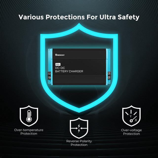 Renogy's DC-DC battery charger works seamlessly with traditional and smart alternators. The included D+ Ignition cable identifies generator starts, safeguarding the starting battery from over-discharge and protecting the generator. (Recommended: 18-16AWG copper cable. D+ Ignition Cable not included.)