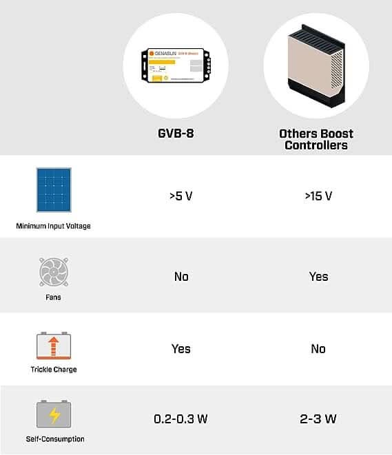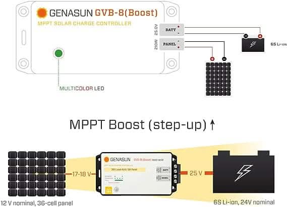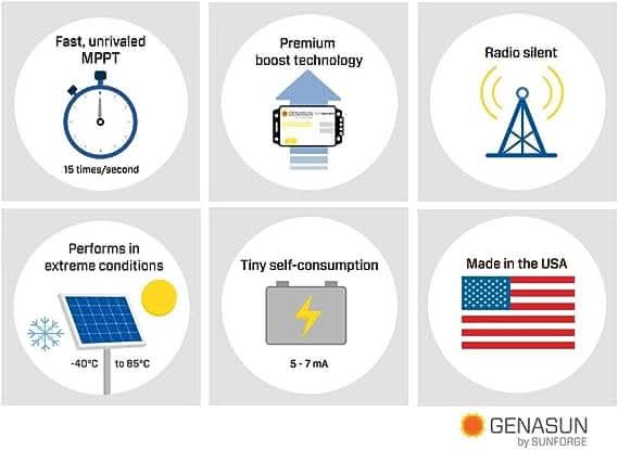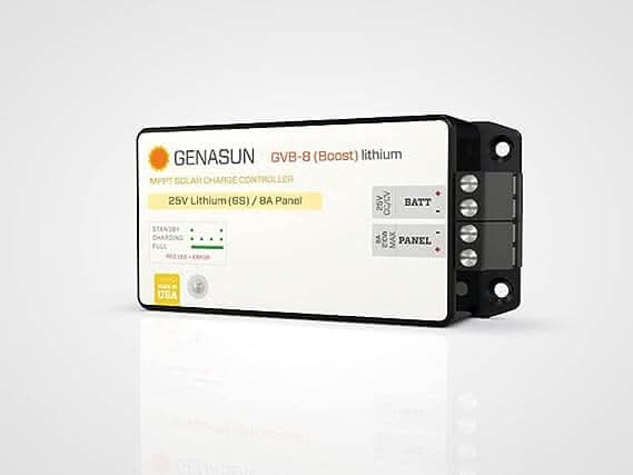 8A Input Capacity: The Genasun charge controller can handle an input current of 8A, effectively managing the energy flow from your solar panel to the battery system.