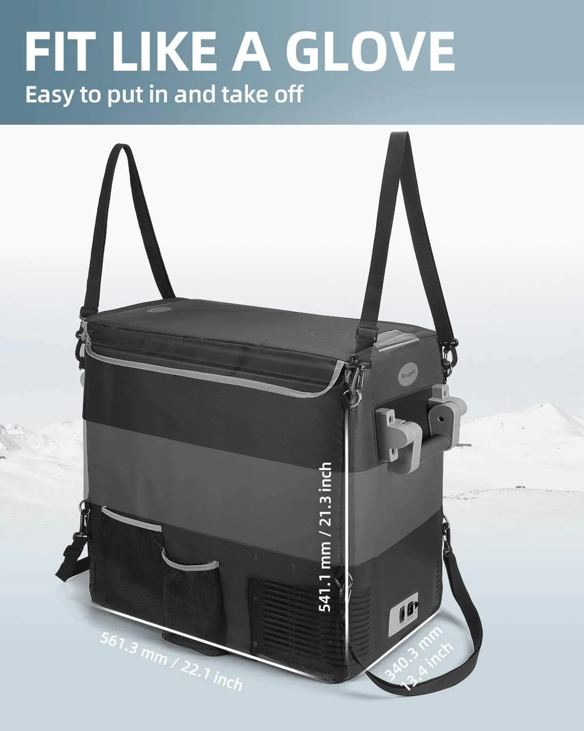53 Quart Insulated Protective Cover: The 53 Quart Insulated Protective Cover is the true partner-in-protection for the portable fridge, providing an additional layer of insulation and shielding. Designed with meticulous attention to detail, this cover enhances cooling efficiency, reducing the workload on the fridge's compressor. Its tailor-made fit and secure fastening mechanisms assure peace of mind.