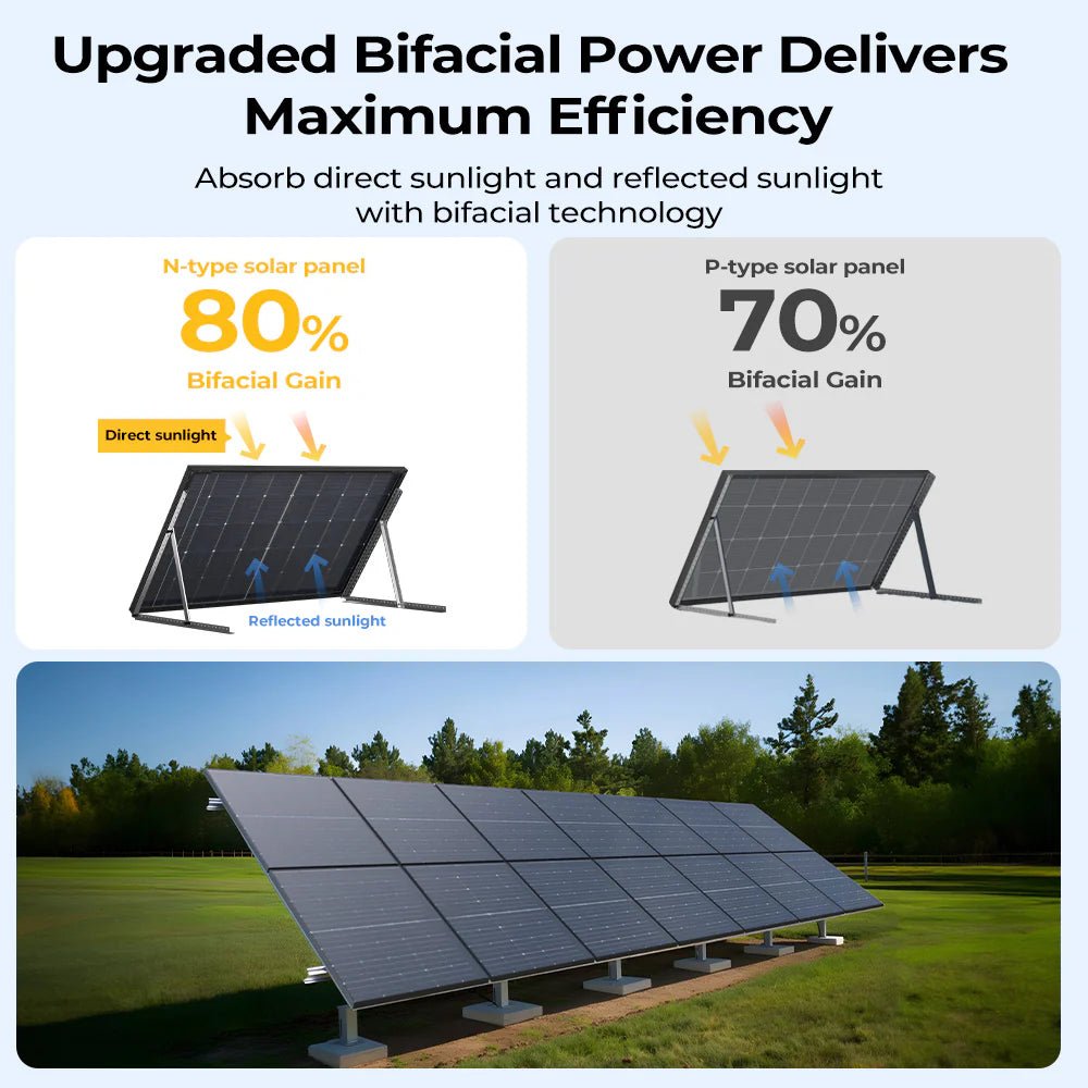 Bifacial Design Increases the solar output by 30%. Instead of having an opaque back, BougeRV bifacial solar panels feature a transparent backside, allowing it to absorb solar energy from both sides, such as direct sunlight, refracted sunlight, and diffuse sunlight. N-type solar cells have an 80% bifacial gain while P-TYPE have only a 70% bifacial gain.