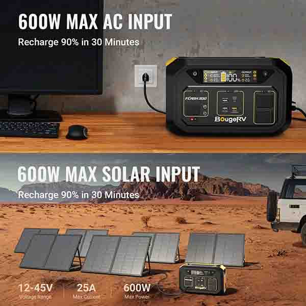 The Flash300 Fast charging power station has a built-in MPPT controller that supports up to 600W of solar input, a 12-45V voltage range, and a 25A maximum input current, so you can combine this fast charging station with other BougeRV solar panels to create a highly efficient solar generator to power your home.