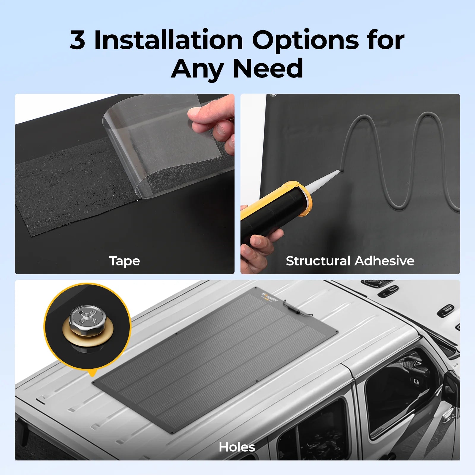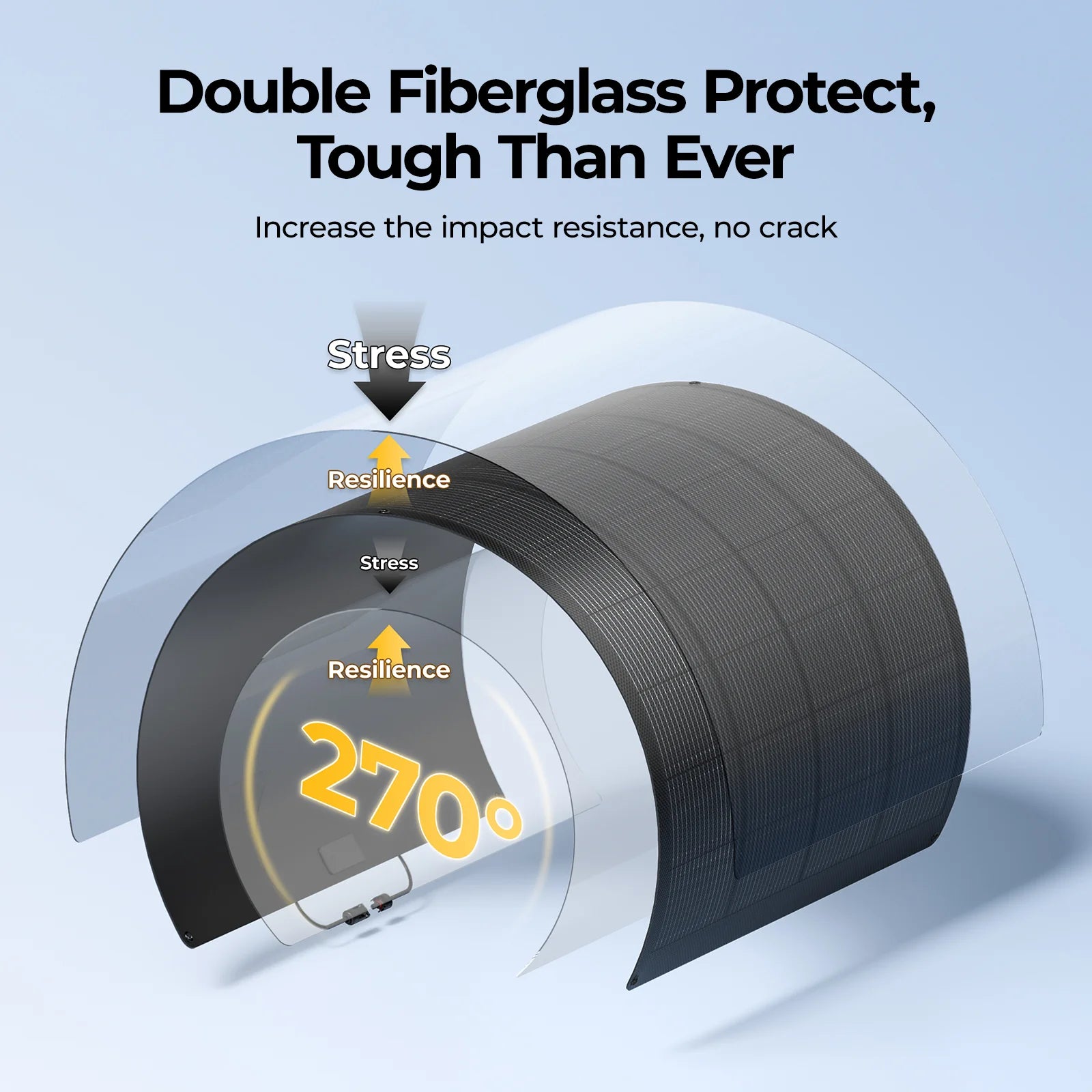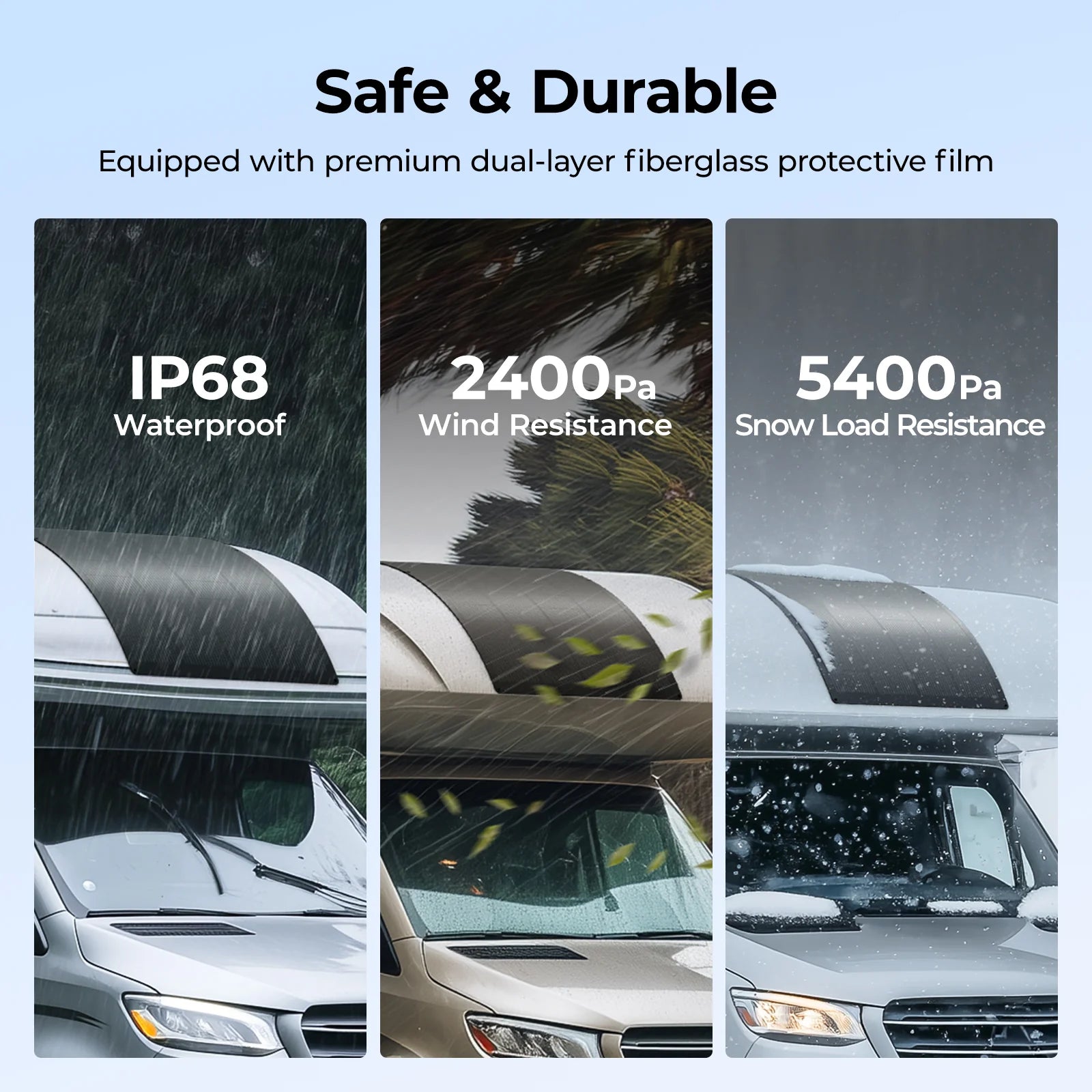 Designed for extreme conditions, the BougeRV curved fiberglass solar panel withstands strong winds (2400 Pa) and heavy snow (5400 Pa), reinforced by corrosion-resistant aluminum for a longer service life.