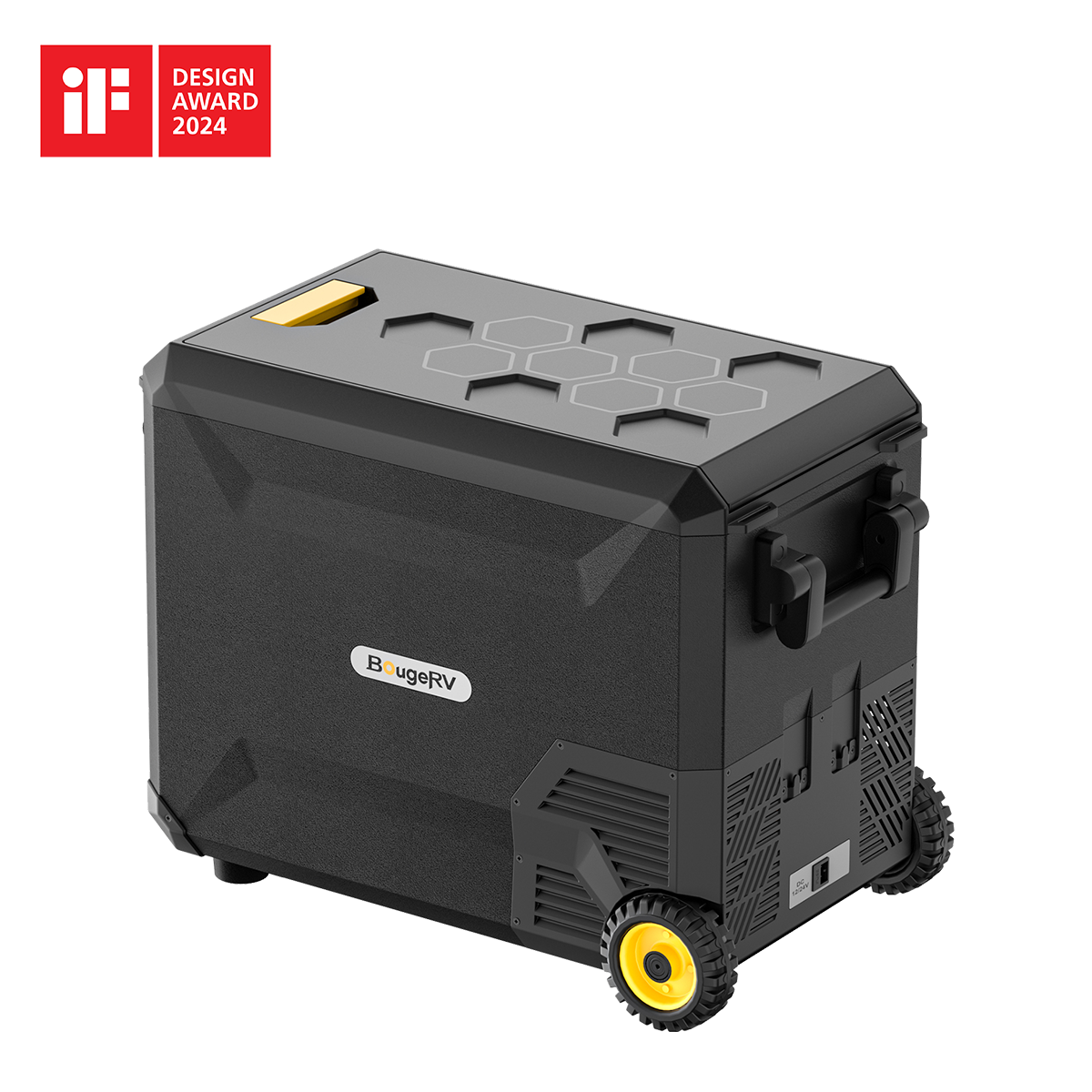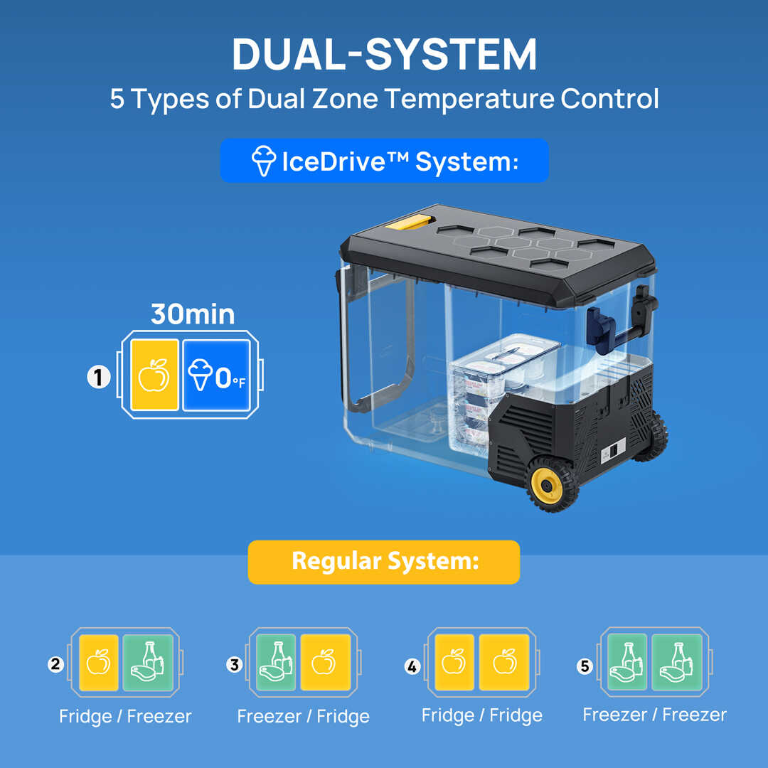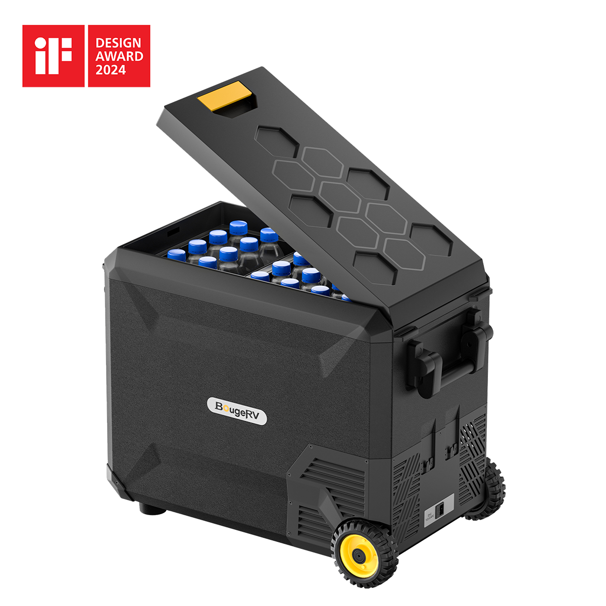 BougeRV ASPEN 40 PRO fridge is equipped with the world's first dual system, consisting of a regular dual zone system and an IceDrive™ system. This innovative feature ensures that the ice cream zone remains consistently below 0°F, while also providing storage space for other frozen foods. With its portable wheels, it is effortless to transport and ideal for camping, RV journeys, and other outdoor activities. Maintain the freshness and chillness of your food and drinks using the ASPEN 40 PRO.