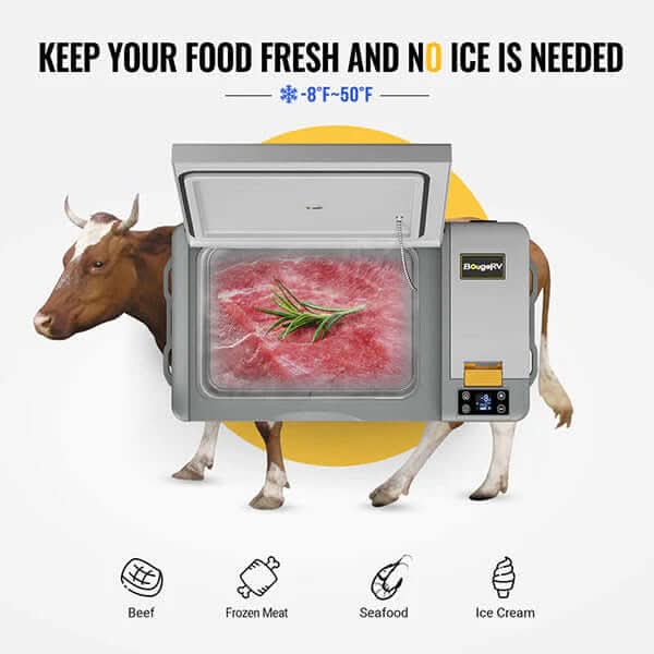 Elegant White Design: The clean and sophisticated white exterior not only complements any vehicle or travel setup but also contributes to the fridge freezer's durability. The high-quality materials used in its construction ensure it withstands the challenges of outdoor adventures.