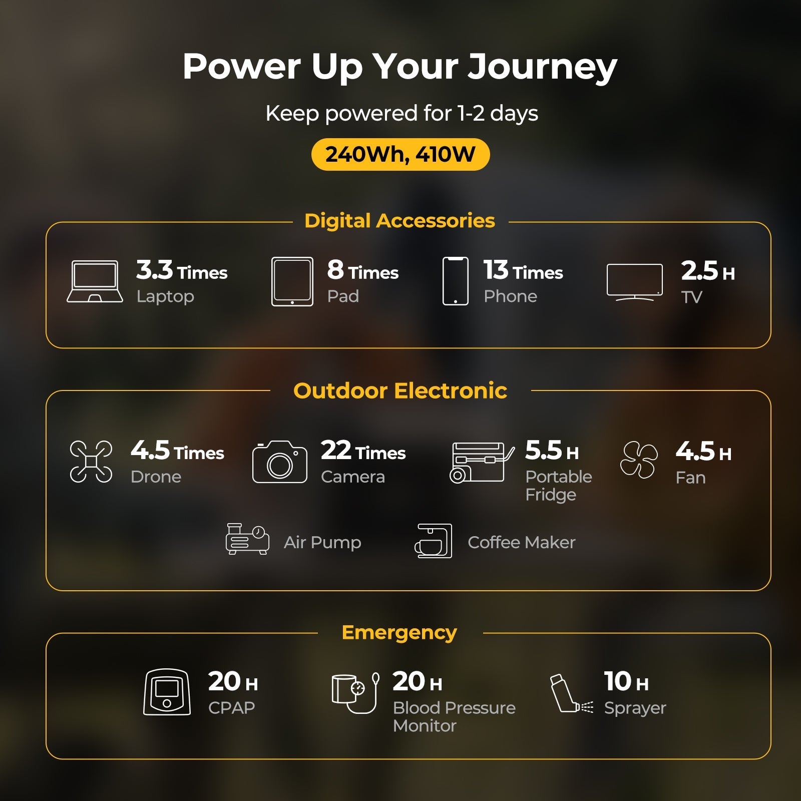 JuiceGo portable power station is a compact and easily portable device with robust features and versatility for charging different devices. It has a capacity of 240Wh, multiple charging inputs, and can charge multiple devices at the same time. JuiceGo is a reliable and eco-friendly option for your power requirements. Its portability and versatility make it suitable for various outdoor activities. Whether camping, hiking, or needing a dependable power source while on the move, JuiceGo is a lightweight and powerful solution you can trust.
