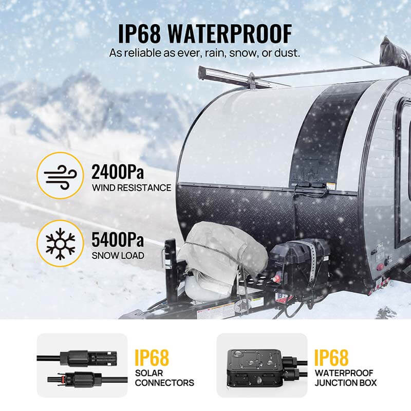 Duo Power Performance: Featuring two 200W Thin Flexible Solar Panels, this set delivers a total power output of 400W. The rectangular shape, enhanced by an special backing, simplifies installation, enabling you to transition effortlessly to solar energy.