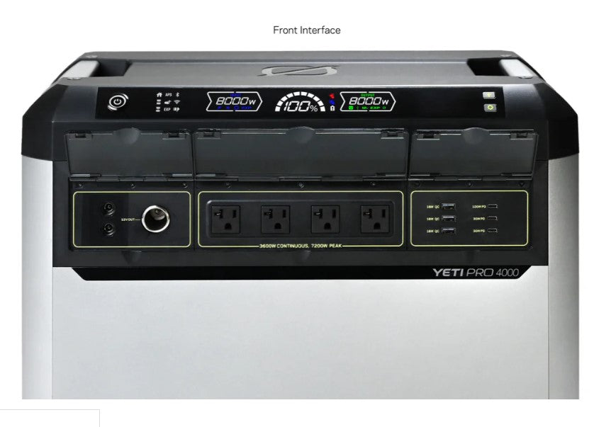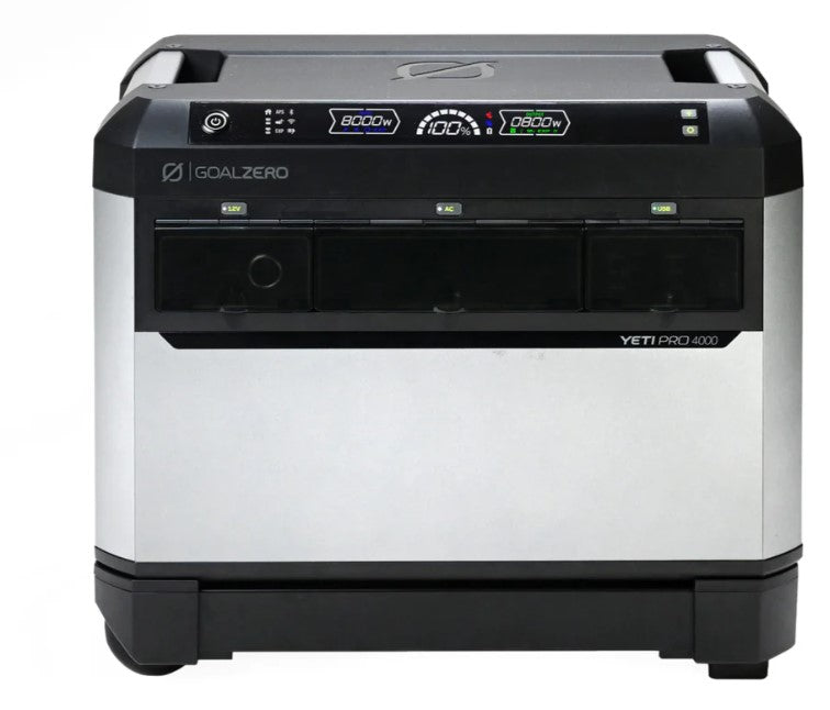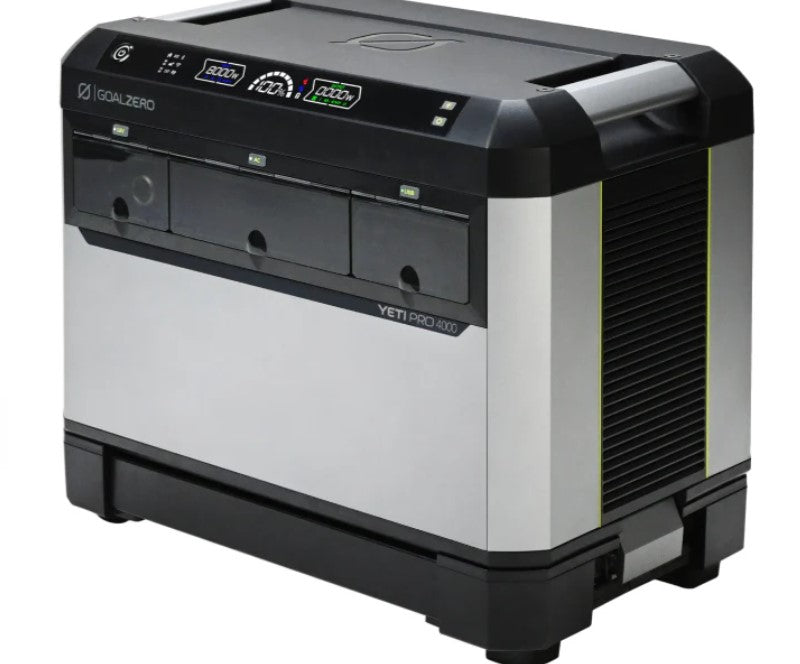 The Yeti PRO 4000 offers over 3 times the charging speed of previous generation products. It has 1800 W AC power in to charge from 0% to 80% in 2 hours and 3,000 W solar input to charge from 0% to 100% in under 2 hours while you're off grid.