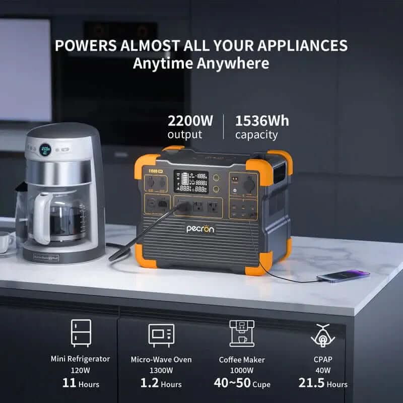 Pecron E1500LFP has an excellent load capacity of 2200 watts, and has super fast charging. It can meet regular outdoor and home emergency use, and its compact design is very convenient to carry. You can use WIFI remote control the E1500LFP power station even when you are away at work!