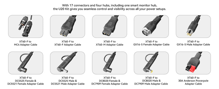 U20 Universal Cable Kit with 17 Different XT60 Adapter Cables, 3*Z30 Hub, 1*Monitor Hub, XT60-F to MC4/DC5525/Cigarette Adapter/XT60 Female/XT60 Male for Power Station, Solar Panel.