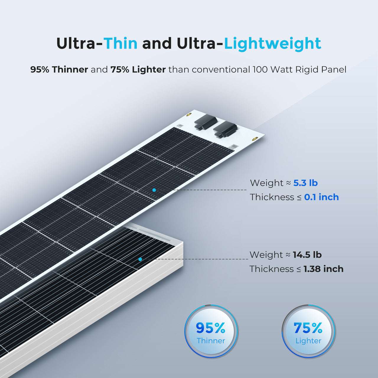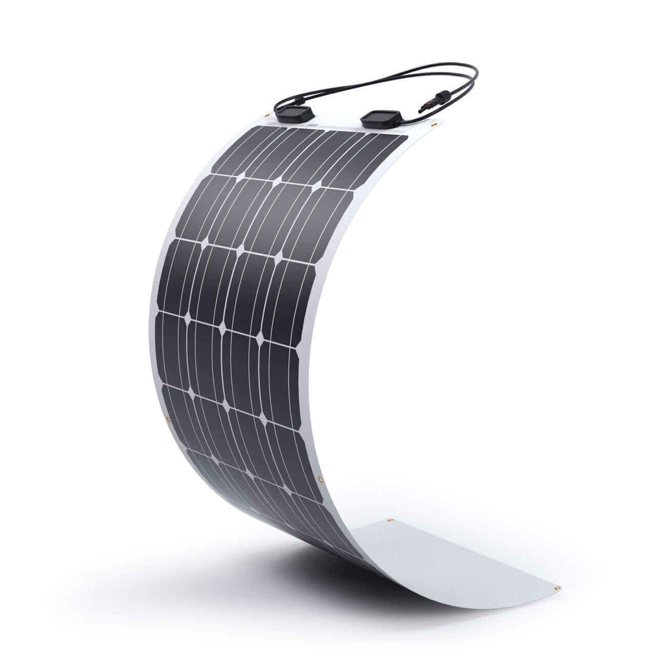 The Renogy 100W Flexible Solar Panel is anything but traditional. Perfect for marine use or placement on top of a van or vehicle with an IP68 rated waterproof junction box and IP67 rated solar connectors, the Renogy 100W Lightweight Solar Panel is ultra-thin and capable of flexing up to 248 degrees. It's 75% lighter and 95% thinner compared to the traditional 100W rigid counterpart, making it an ideal alternative for load-sensitive structures and uneven surfaces.