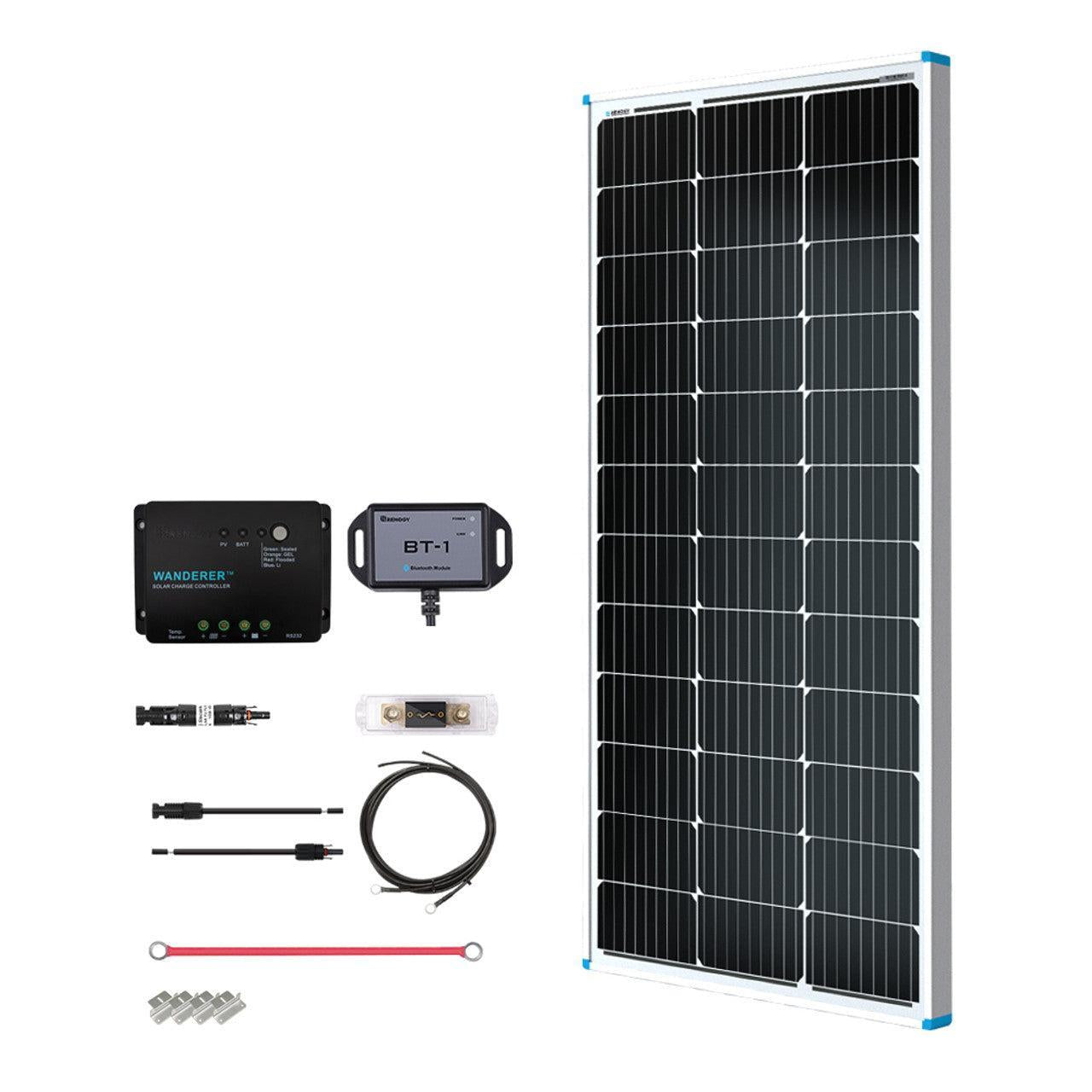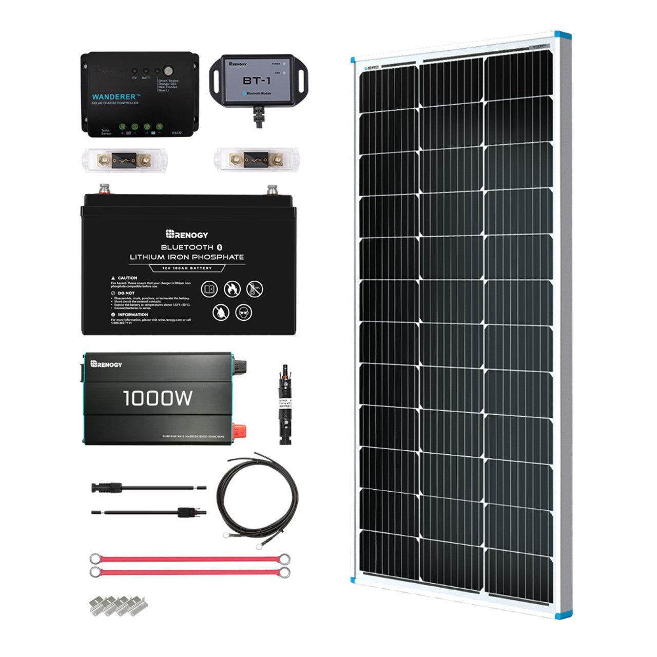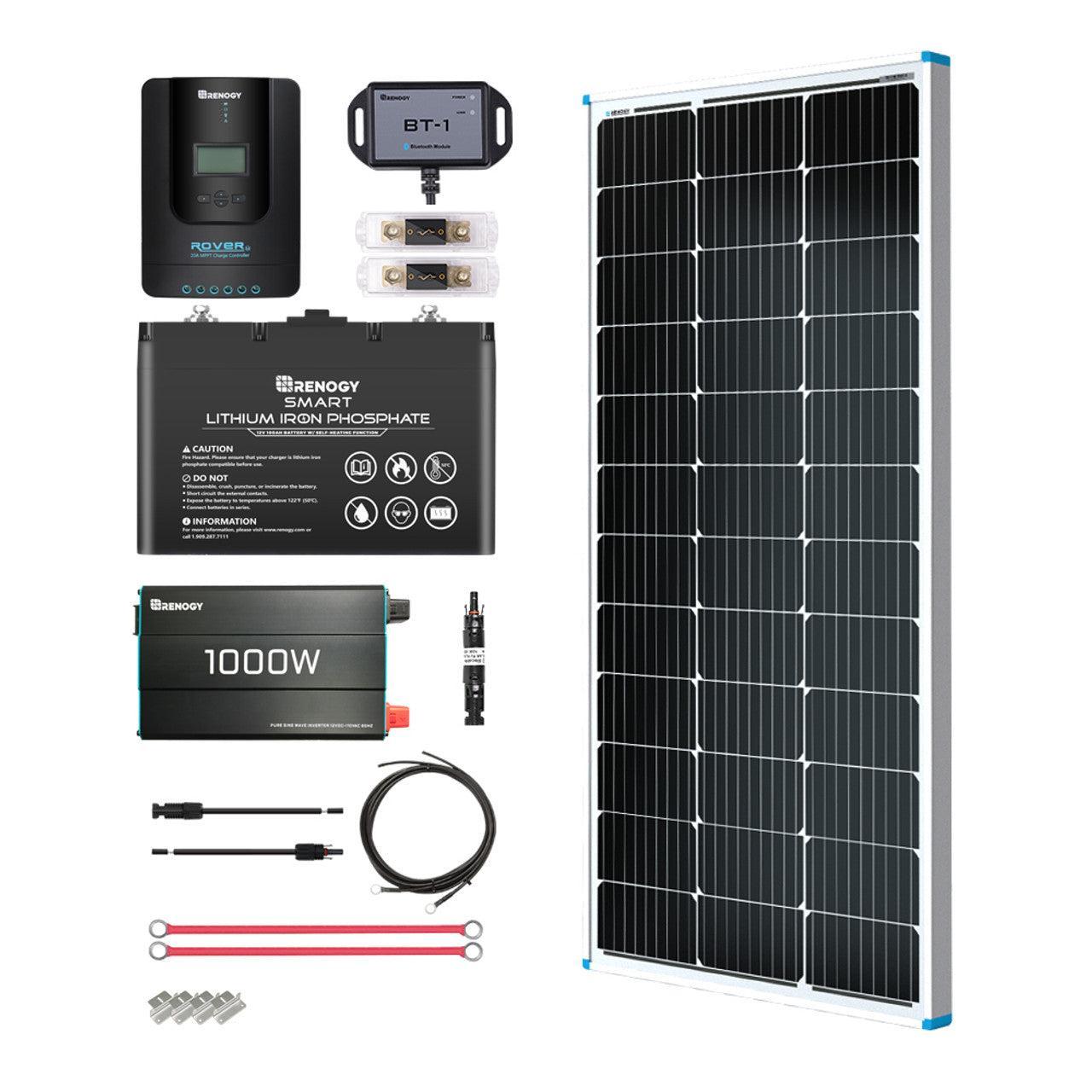 The Kits come with 1pcs of 100W classic rigid (or ultra flexible) solar panels, 1pcs of 20A MPPT charge controller from the classic Rover series or the 10A or 30A PWM charge controller , no battery or 1pcs of 100Ah smart lithium battery with self heating feature (or the economical lithium battery with built-in Bluetooth), no inverter or 1pcs of 1000W pure sine wave inverter (or inverter charger), and all necessary accessories including cables, connectors, mounts and monitoring to connect the main components you have chosen.