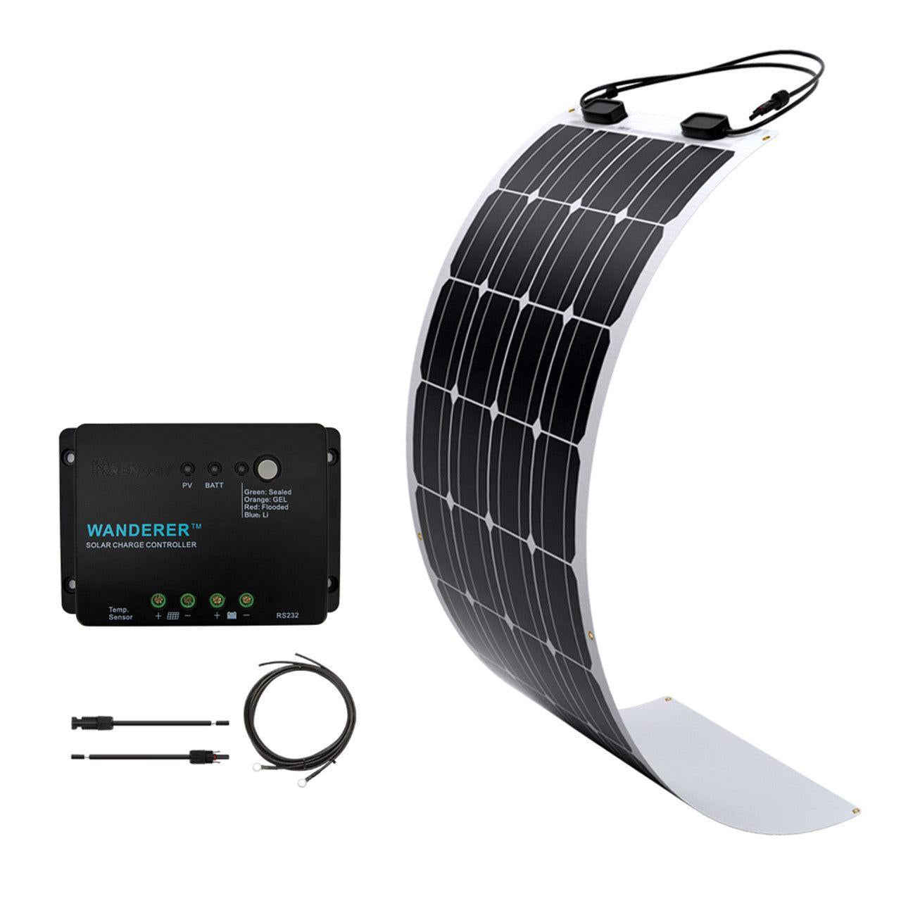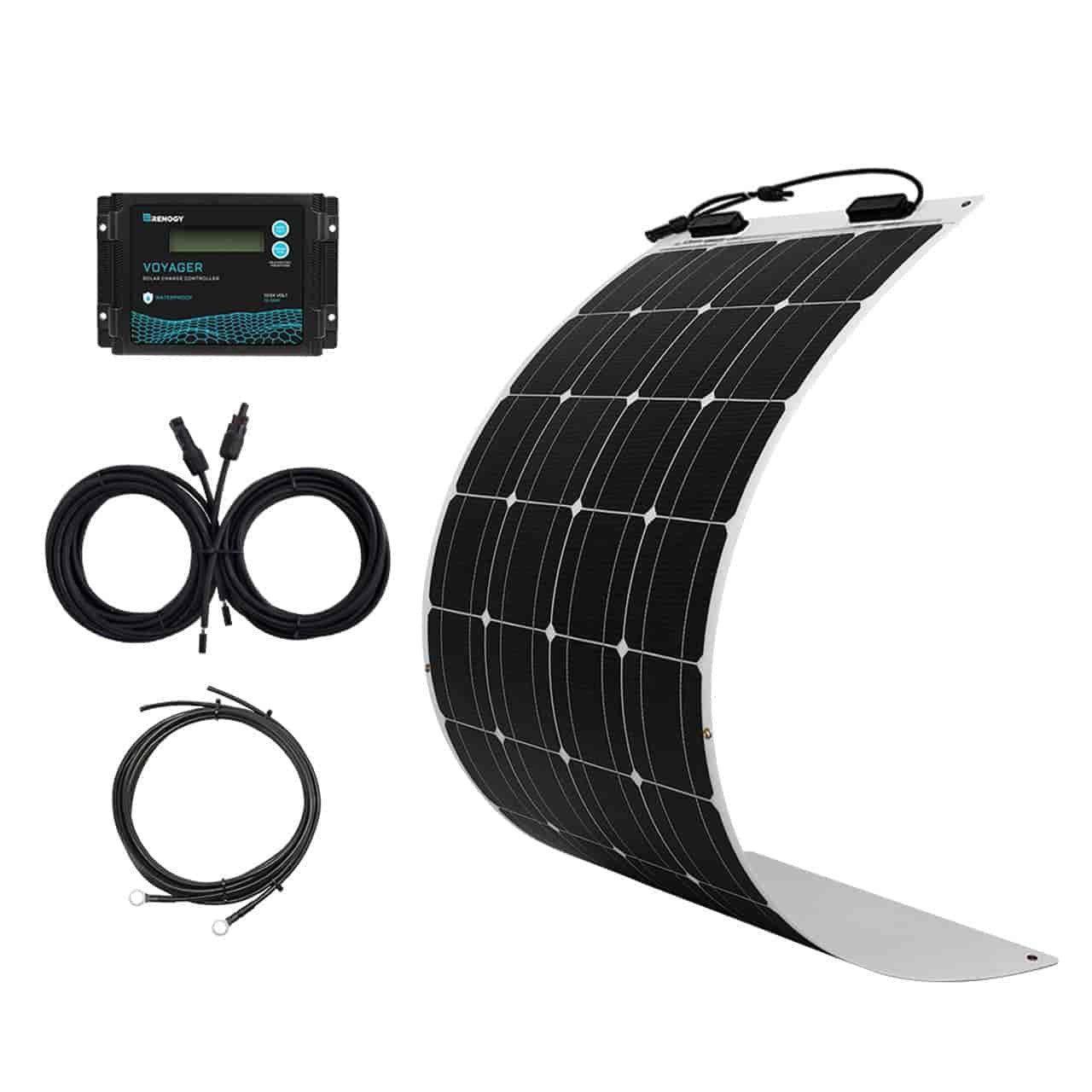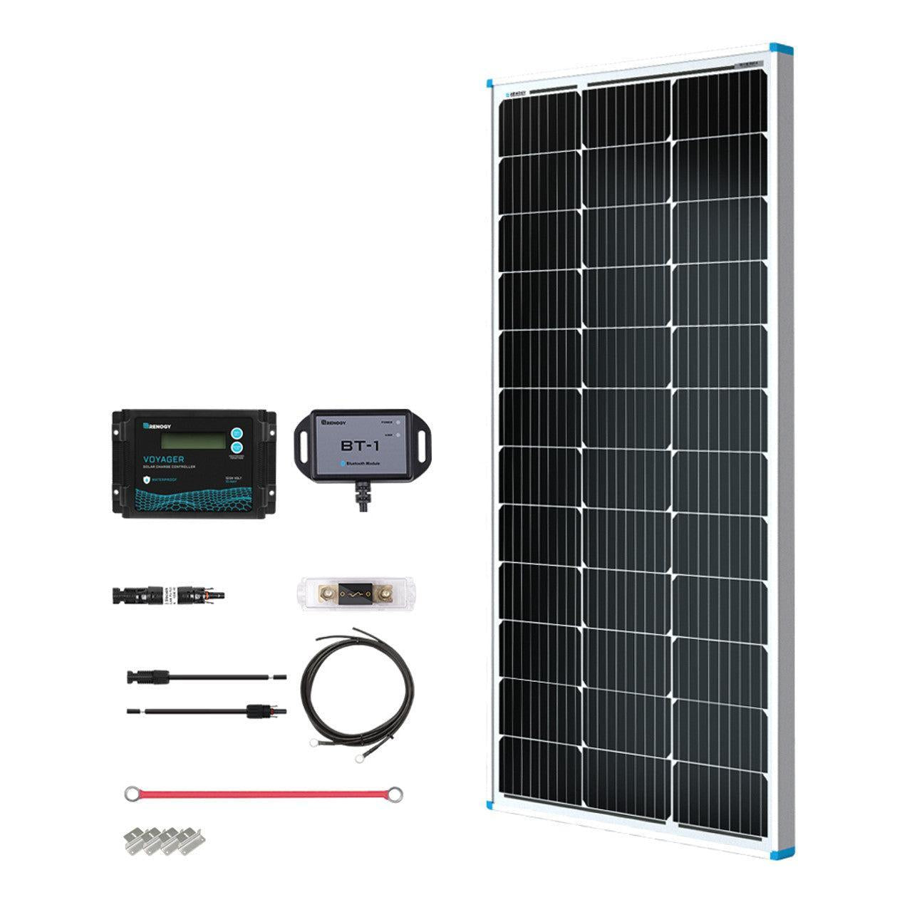 The Kits come with 1pcs of 100W classic rigid (or ultra flexible) solar panels, 1pcs of 20A MPPT charge controller from the classic Rover series or the 10A or 30A PWM charge controller , no battery or 1pcs of 100Ah smart lithium battery with self heating feature (or the economical lithium battery with built-in Bluetooth), no inverter or 1pcs of 1000W pure sine wave inverter (or inverter charger), and all necessary accessories including cables, connectors, mounts and monitoring to connect the main components you have chosen.