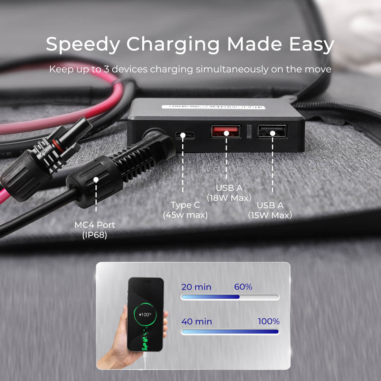 Charging is quick and flexible. The station accepts up to 1300W input across multiple ports, with 600W maximum solar input. Using solar panels, you'll fully charge in 2-3 hours. Need it faster? Dual AC adapters cut that time to just 1.5-2 hours.