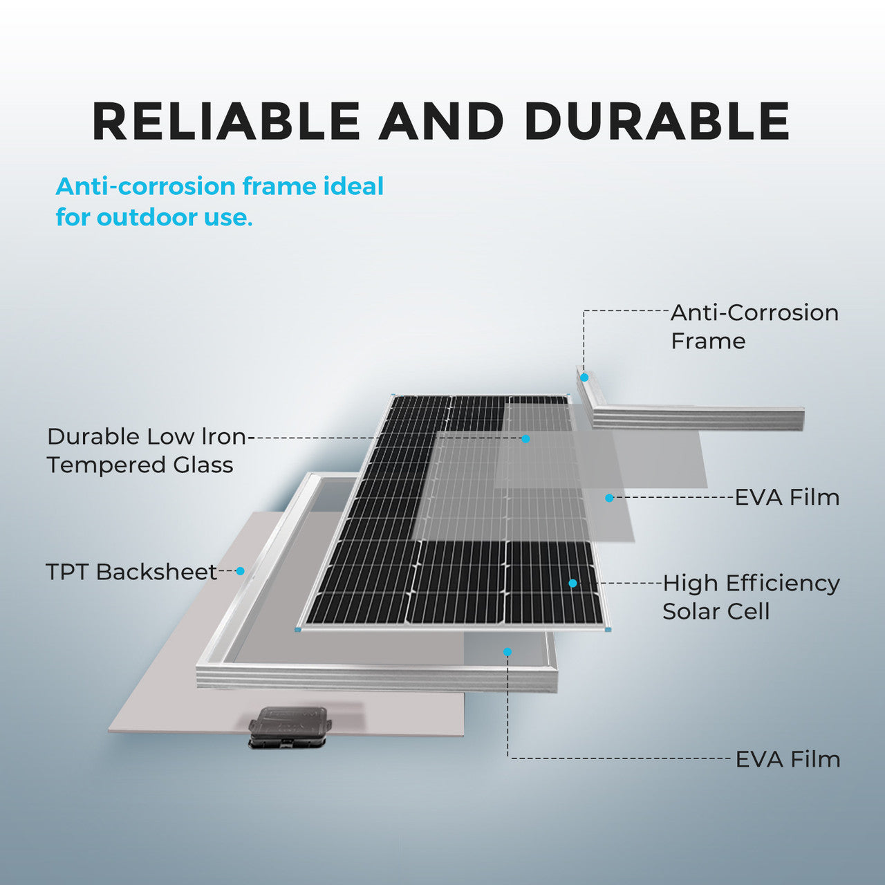 The Premium Kit will produce an average of 3.5-4kWh of electricity per day (Based on 5 hours of direct sunlight conditions). The 8 x 100W solar panels don't take up much roof space, but their energy can offset some large-size loads such as television, washing machine, electric stove, etc. With the Rover Li 60A MPPT charge controller, the kit can meet your further power needs by adding more of the same solar panels; for example, a 24V system expandable up to 1600W.