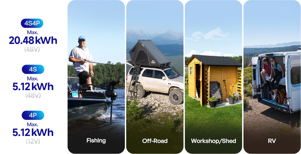Build your ideal power system with up to 4 batteries in series and 4 in parallel (4P4S), delivering up to 20.48kWh. Great for trolling motors, RVs, workshops, and off-road systems. Can adapt to various setup.
