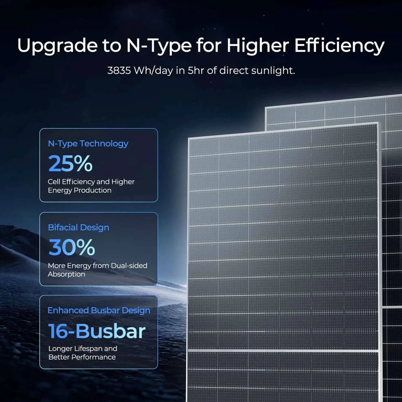 - 25% Cell Efficiency with N-Type cells for higher output and durability