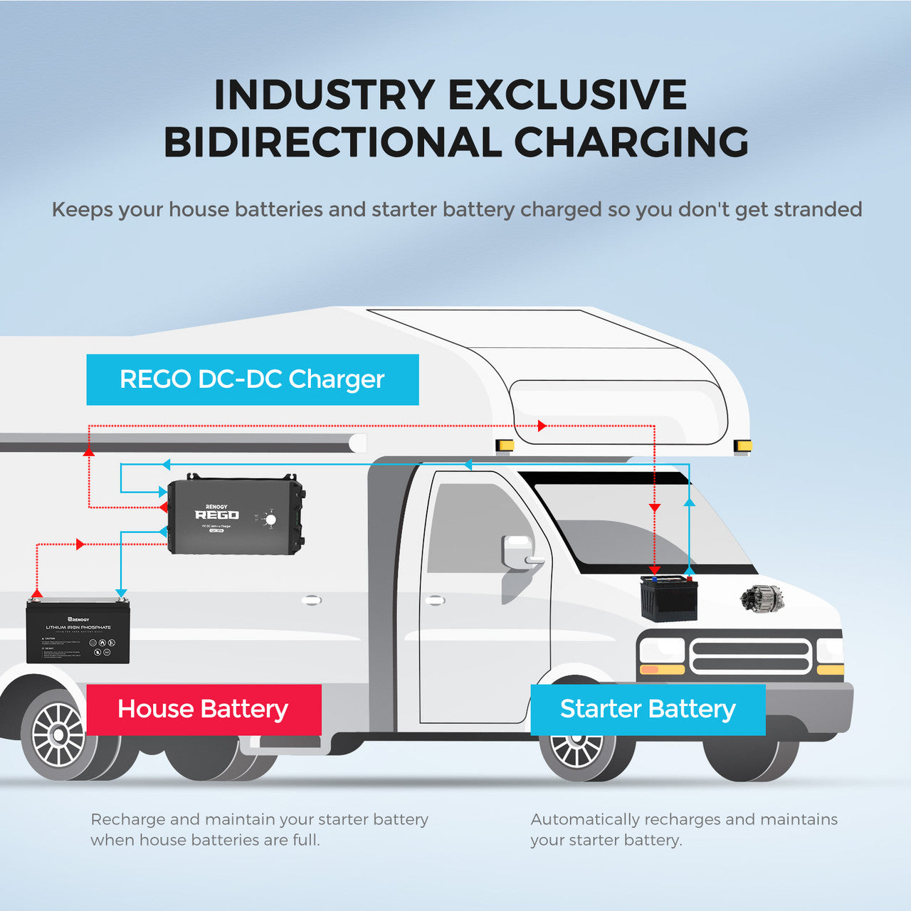 Renogy’s bidirectional charging system uses state-of-art technology to charge your house and starter batteries when driving. REGO smart chargers switch to charging your starter battery when house batteries are full to ensure you have all the power you need at your destination.