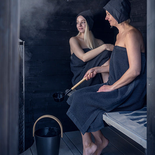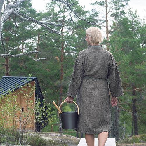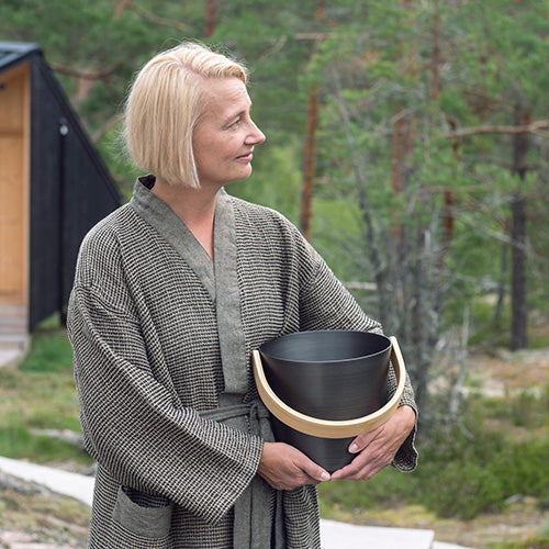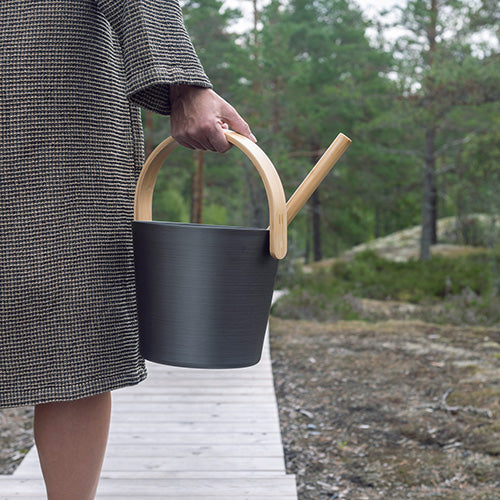 Timeless design combined with user-friendly shapes make this sauna bucket a must-have. The metal part is color-anodized aluminum with a curved handle of heat-treated bamboo, and comes in multiple colors to choose from.