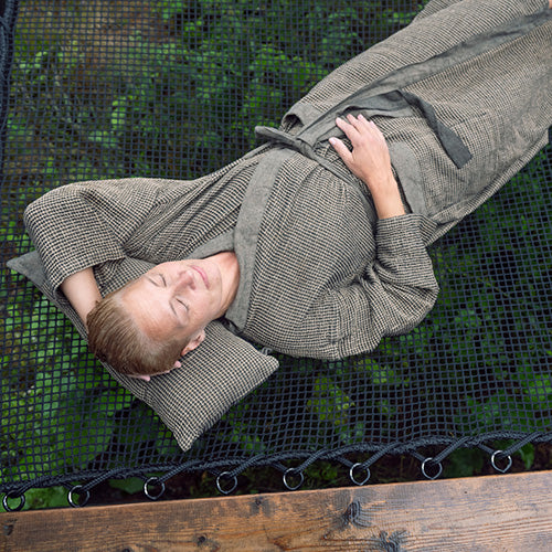 Comfy bath robe with chambray borders and belt comes in size S/M. Kenno sauna textiles are made of recycled cotton, giving the fabric a natural softness and vibrant texture with multiple colors to choose from.