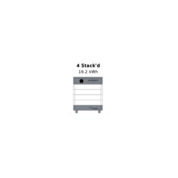 HomeGrid Stack'd Series LFP - 4 Stack: The HomeGrid Stack'd Series LFP, offered in a 4-stack configuration, is a modular home battery with 4.8 kWh increments, allowing a capacity range of 9.6 to 38.4 kWh per stack. This modularity facilitates easy servicing and future expansion. With a continuous output of up to 15 kW and a surge capacity of up to 24 kW for 10 seconds, it ensures true full-home backup capabilities. The bundle includes 1 base and 4 4.8 kWh modules, providing a total capacity of 19.2 kWh.